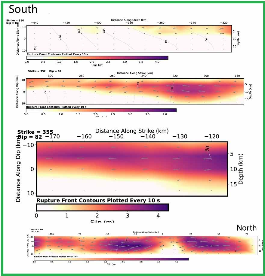Поперечное сечение распределения сдвига. Направление простирания указано над каждой плоскостью разлома, а местоположение гипоцентра обозначено звездочкой. Амплитуда сдвига показана цветом, а направление движения висячего бока относительно лежачего бока (угол наклона) указано стрелками. Контуры показывают время начала разрыва в секундах.