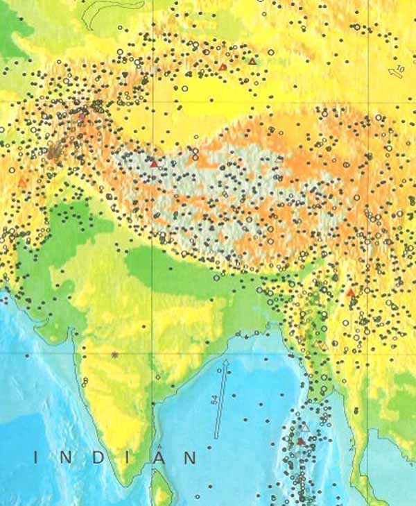 The collision between the Indian subcontinent and the Eurasian continent, causing frequent large earthquakes between India and Tibet and throughout Tibet and surrounding areas (shown by circles and dots on this map).