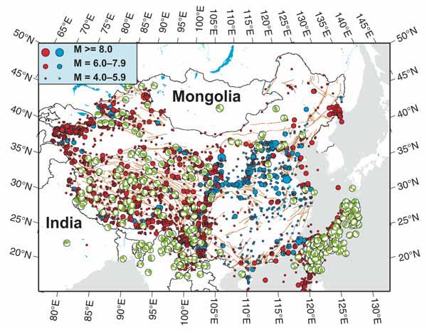 Neotectonic studies in the North China block and extensive global positioning systems (GPS) measurements in China have greatly refined the knowledge of crustal kinematics. The driving mechanisms and their interplay with lithospheric structures control seismicity in China. Neotectonic studies have shown a strong influence of plate boundary processes on the diffuse crustal deformation in China and surrounding regions (Tapponnier and Molnar, 1977, 1979; Wesnousky et al., 1984; Ye et al., 1985; Burchfi el et al., 1991; Avouac and Tapponnier, 1993; Xu et al., 1993; Allen et al., 1998; Zhang et al., 1998, 2003). The GPS measurements have provided many details of crustal motion in China and surrounding regions. Consistent with neotectonic data, GPS data indicate weak crustal deformation in East Asia. The geodynamic models of different spatial scales, constrained by the GPS and neotectonic data, using to explore the major driving forces and critical boundary conditions for active crustal deformation in China and neighboring regions. Active crustal deformation in China and surrounding regions is controlled by: