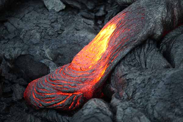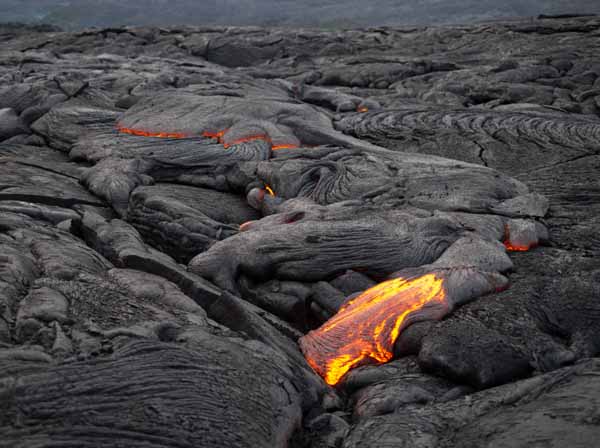 Cutaway view (not to scale) of Kilauea Volcano shows the pathway of molten rock during the eruption of Puu Oo, cinder-and-spatter cone on Kīlauea located on the east rift zone about 20 km from the caldera. Molten rock moves from the magma reservoir beneath the caldera through the east rift zone to Puu Oo. When molten rock erupts as lava from Puu Oo, it flows either onto the surface or through a lava-tube system 10-11 km to the sea.